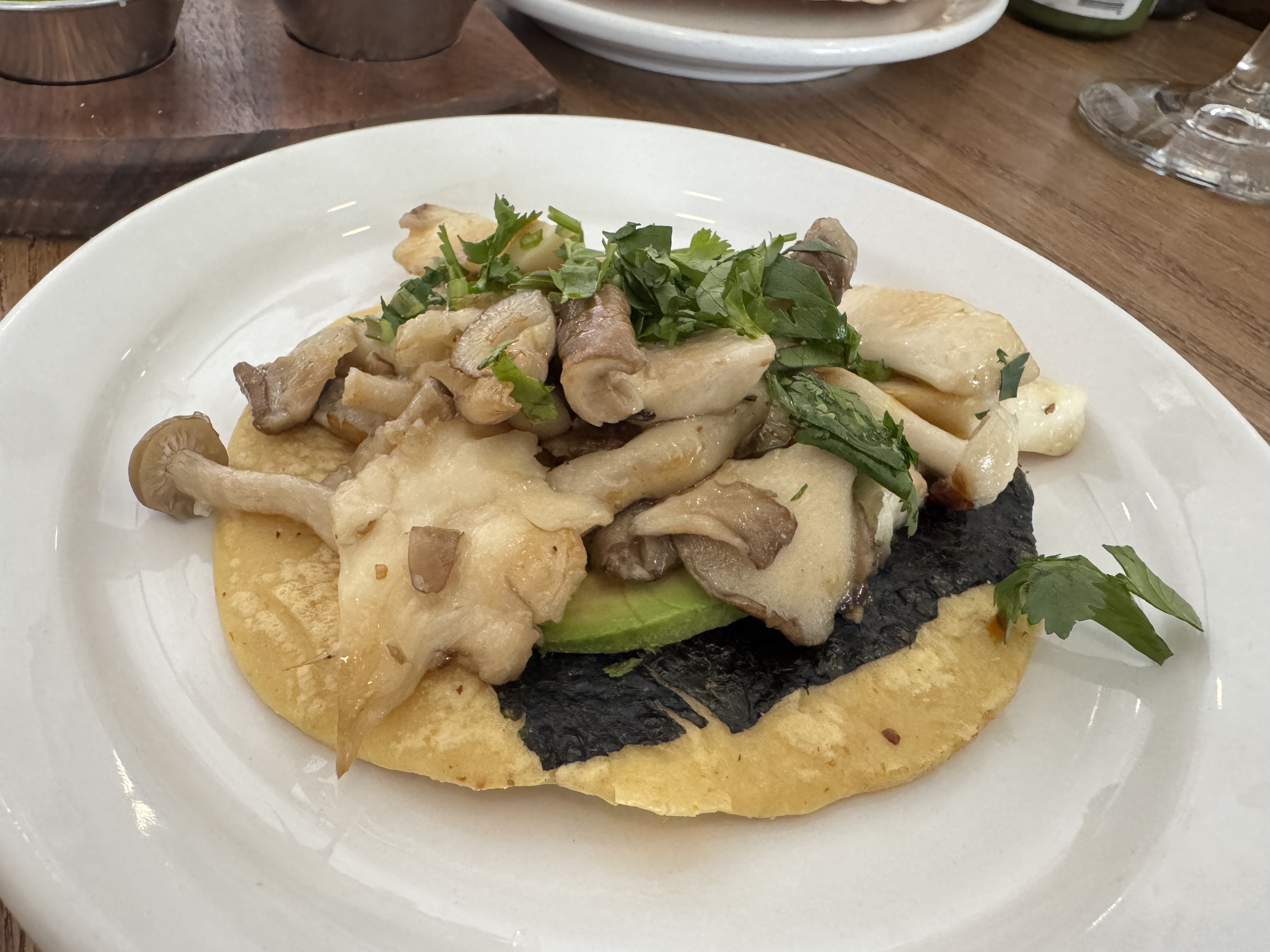 타코가 생각보다 양이 작아 하나더 주문! 탱탱한 버섯의 육질과 고수,박하잎의 향긋함이 더해 담백한 맛이 일품이었던 버섯타코! 한번씩 생각날거 같아요~ 고수 못 드시는 분은 빼달라고 미리 말씀해 주세요!! 그리고 토르티야(큰 만두피같이 생긴 타코를 감싸는빵)에 김이 붙어있어먹을때 김의 익숙한 맛이 감도는데 이것도 정말 맛에 포인트를 주더라고요