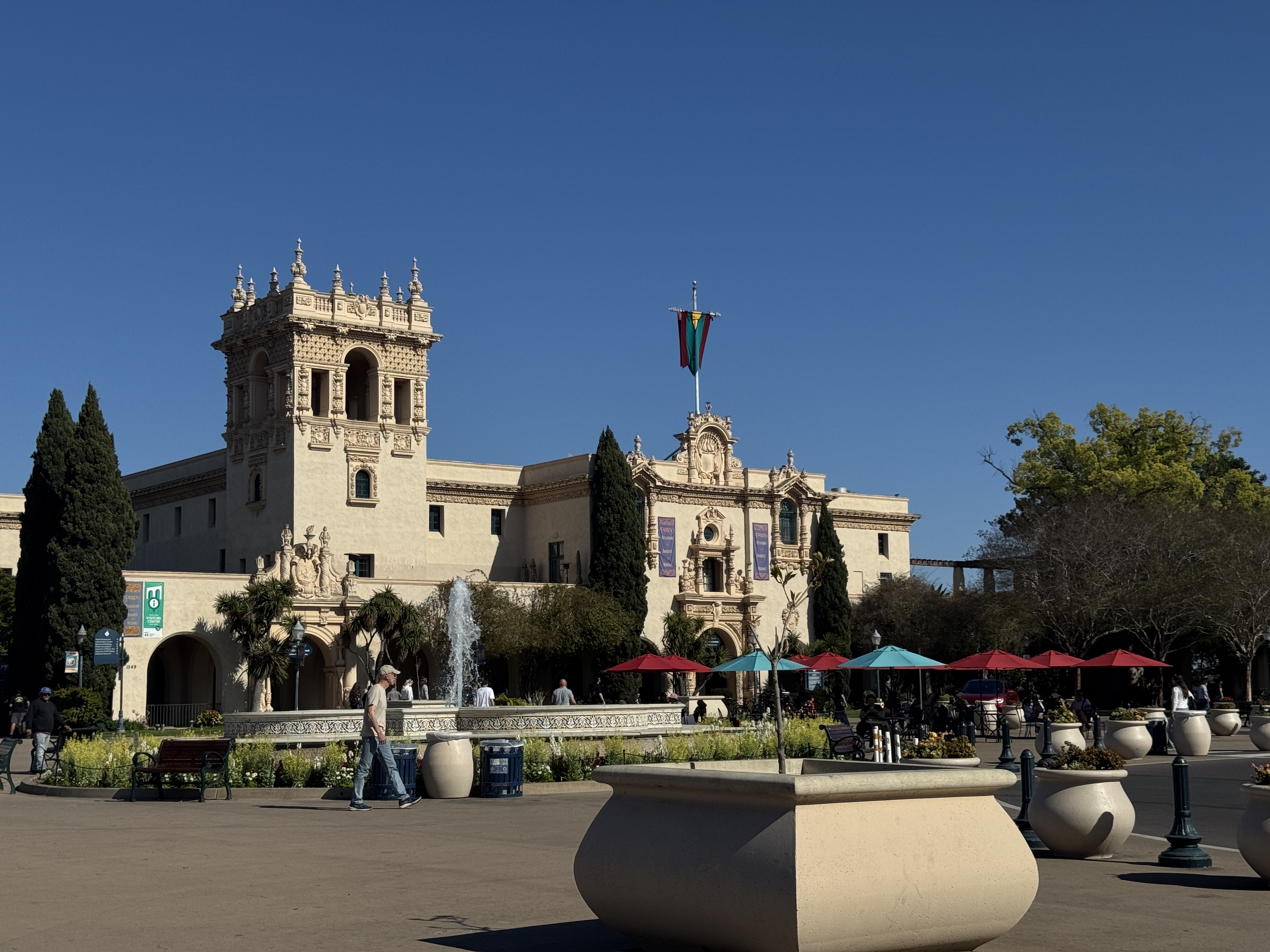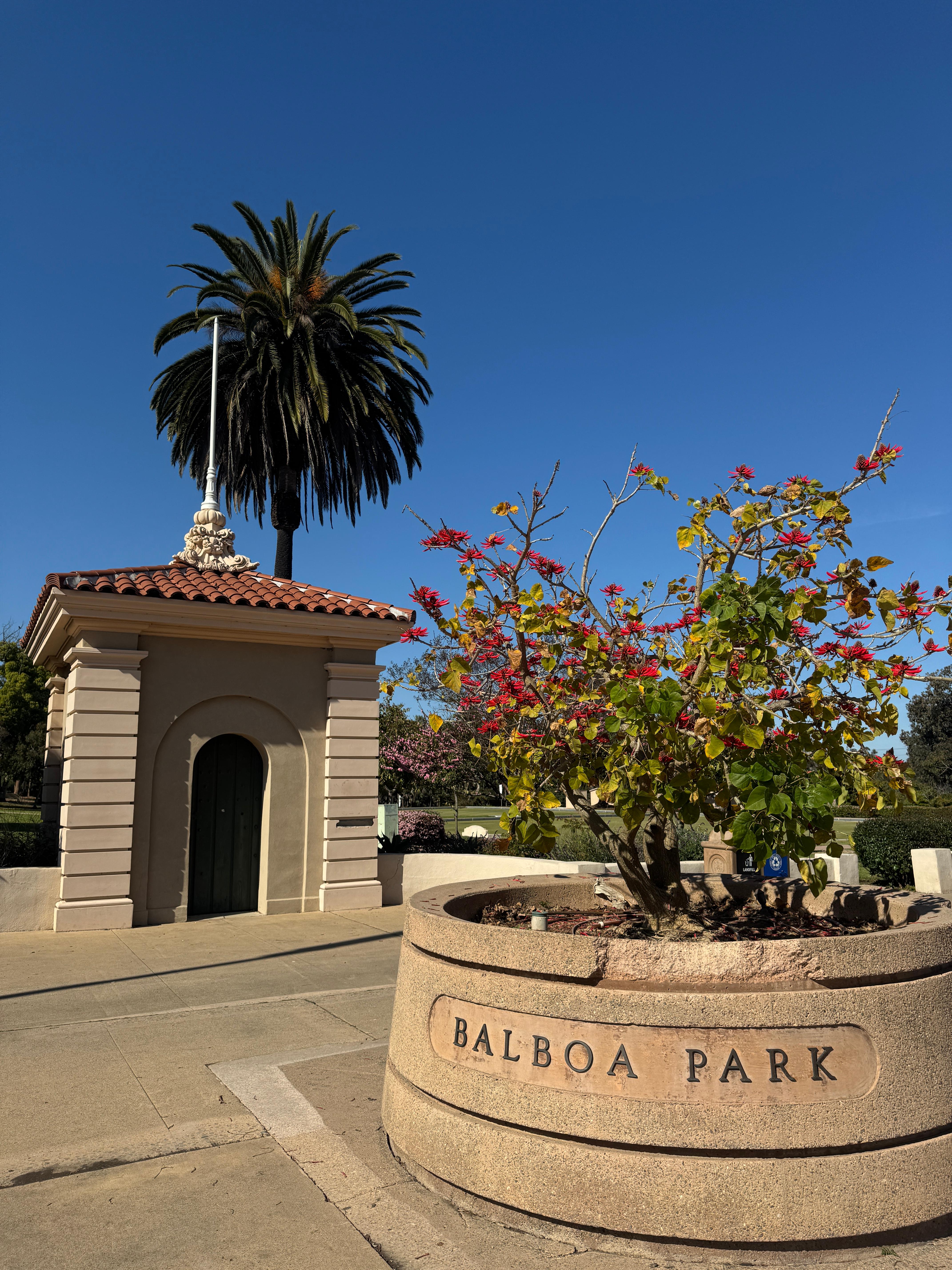 잠시 휴식을 취한 뒤에는 발보아 공원으로 이동했어요. 호텔에서 한 30분은 족히 걸어야 하는 거리에 있었는데 저는 그냥 운동삼아 걸어서 도착했어요~ 올때는 구경하느라고 체력소모로 우버택시를 이용해 호텔로 복귀했답니다. 미국에 오시면 우버택시 앱은 필수로 깔고 오세요!! 아주 유용하게 사용할 일이 생깁니다 ~ ㅎ. 이곳은 단순한 공원이 아니라, 다양한 박물관과 예술 공간이 어우러진 거대한 복합 공간이에요. 아름다운 건축물 사이로 산책을 하면서 꽃 향기를 맡고, 예술작품도 감상했답니다. 특히 스페니시 스타일의 건물들과 넓게 뻗은 길이 너무 인상적이었어요.